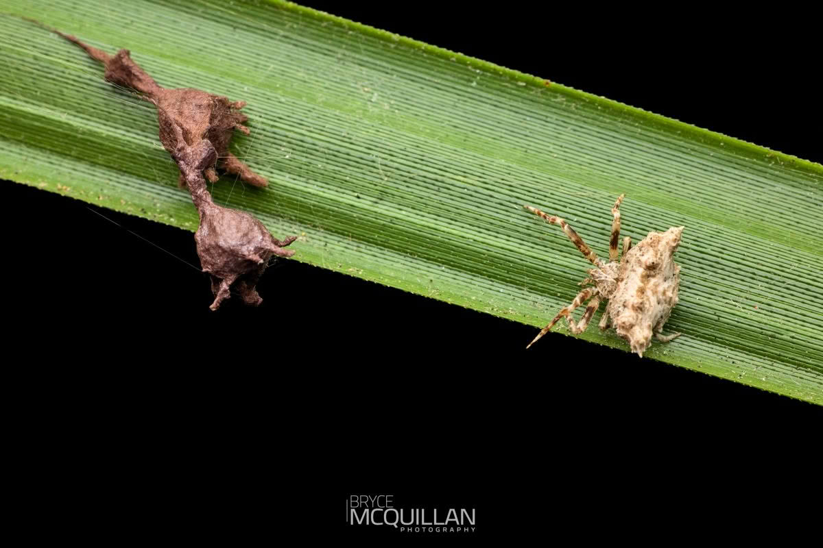 This species is usually found among shrubs and other vegetation, where it can be very difficult to spot. Females are especially distinctive and may also be seen guarding their eggsacs, adding to the unusual appearance of this spider.