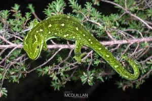 The West Coast Green Gecko (Naultinus tuberculatus) is an endemic gecko found in the western South Island of New Zealand. It is a robust green gecko with intricate moss-like patterning, which helps it blend into shrubs and forest vegetation.