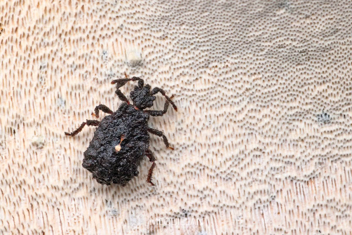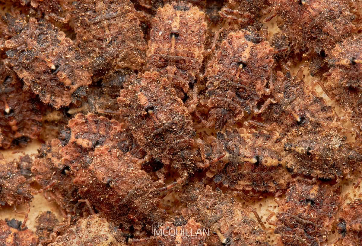 Flat bugs, or Aradidae, are a group of true bugs recognised by their strongly flattened bodies, which allow them to live in narrow spaces such as under bark and within decaying wood. In New Zealand they are usually associated with damp forest habitats, where they can be very easy to overlook.